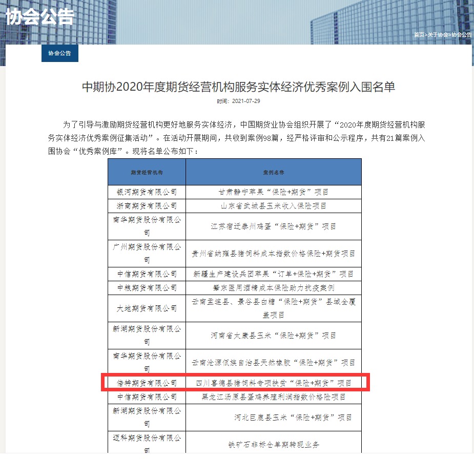 2021年7月29日,中國期貨業(yè)協(xié)會公布了“2020年度期貨經(jīng)營機構(gòu)服務(wù)實體經(jīng)濟優(yōu)秀案例入圍名單”,協(xié)會經(jīng)過嚴格評審,在征集的98篇案例中給予了21篇案例入圍協(xié)會“優(yōu)秀案例庫”,倍特期貨榮譽登榜!瀏覽 : 9336分享